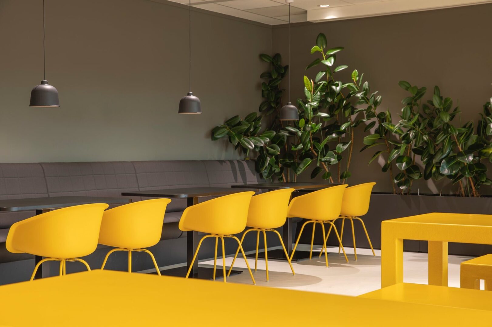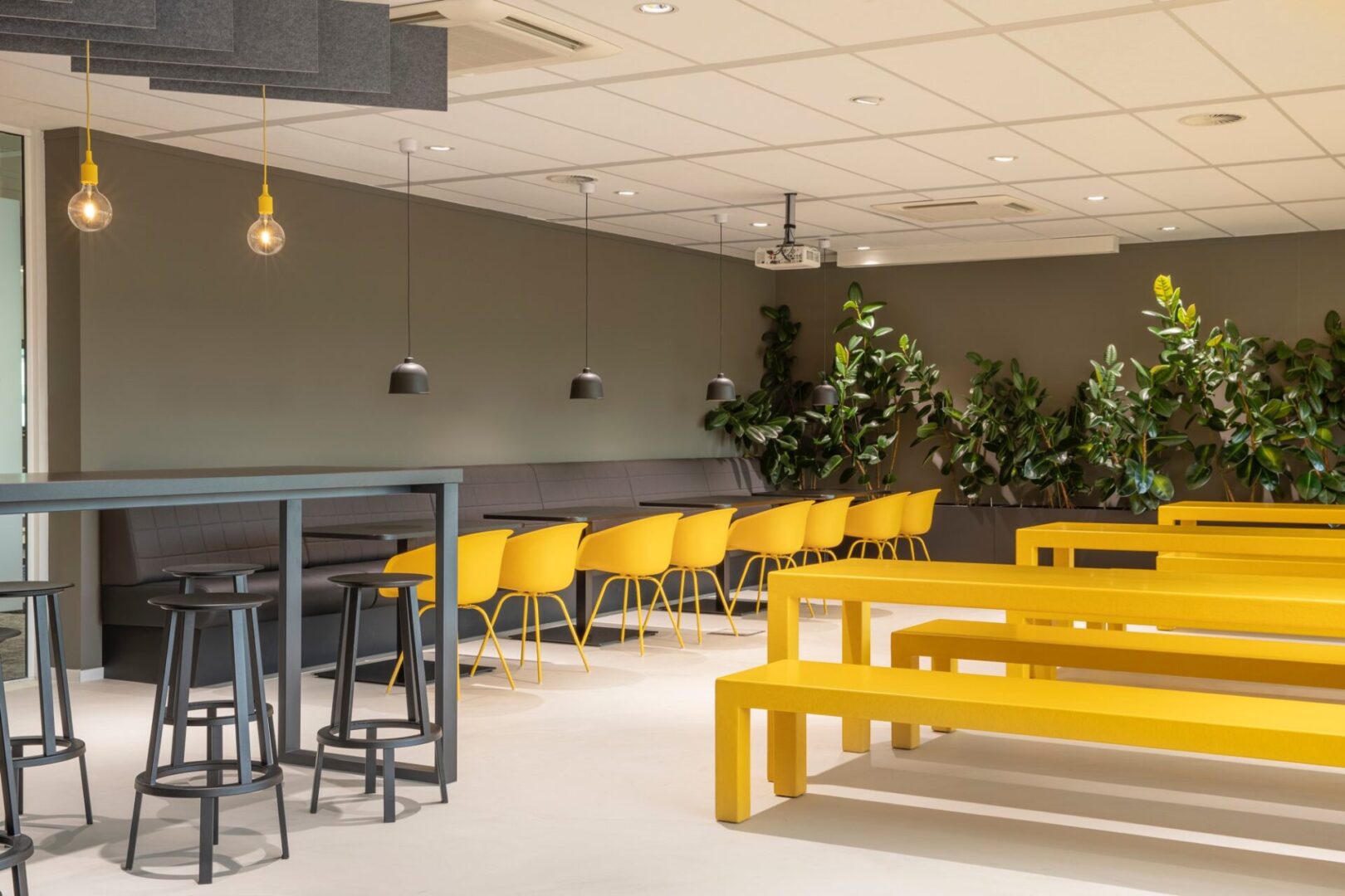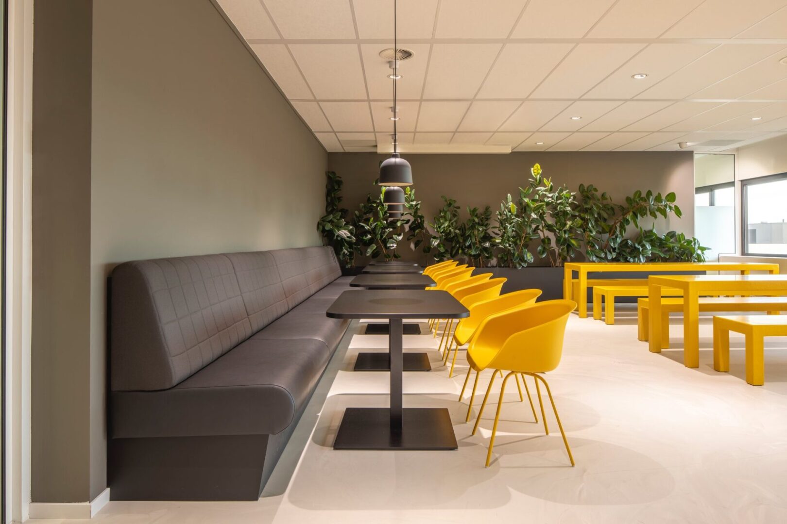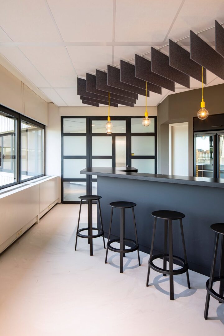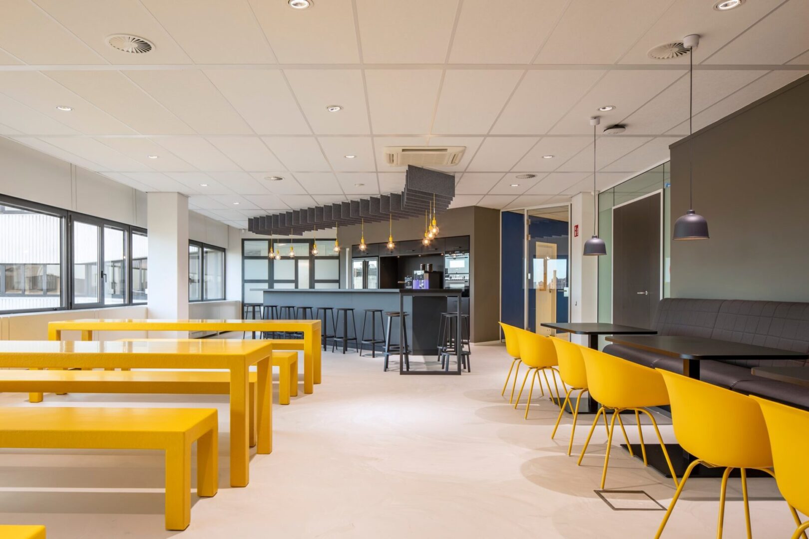 Door de slimme materiaalkeuzes die elders in het kantoor werden gemaakt, was er budget beschikbaar voor de vloer in de kantine. De opdrachtgever wilde graag een op kleur gemaakte gietvloer met betoneffect voor een industriële uitstraling.