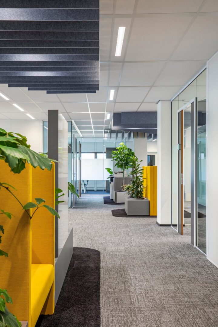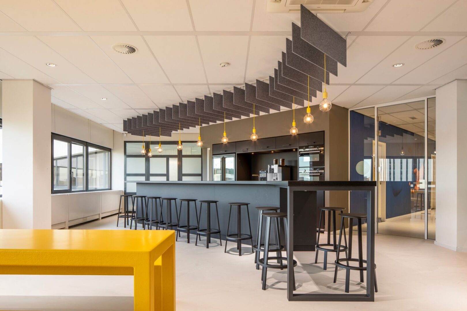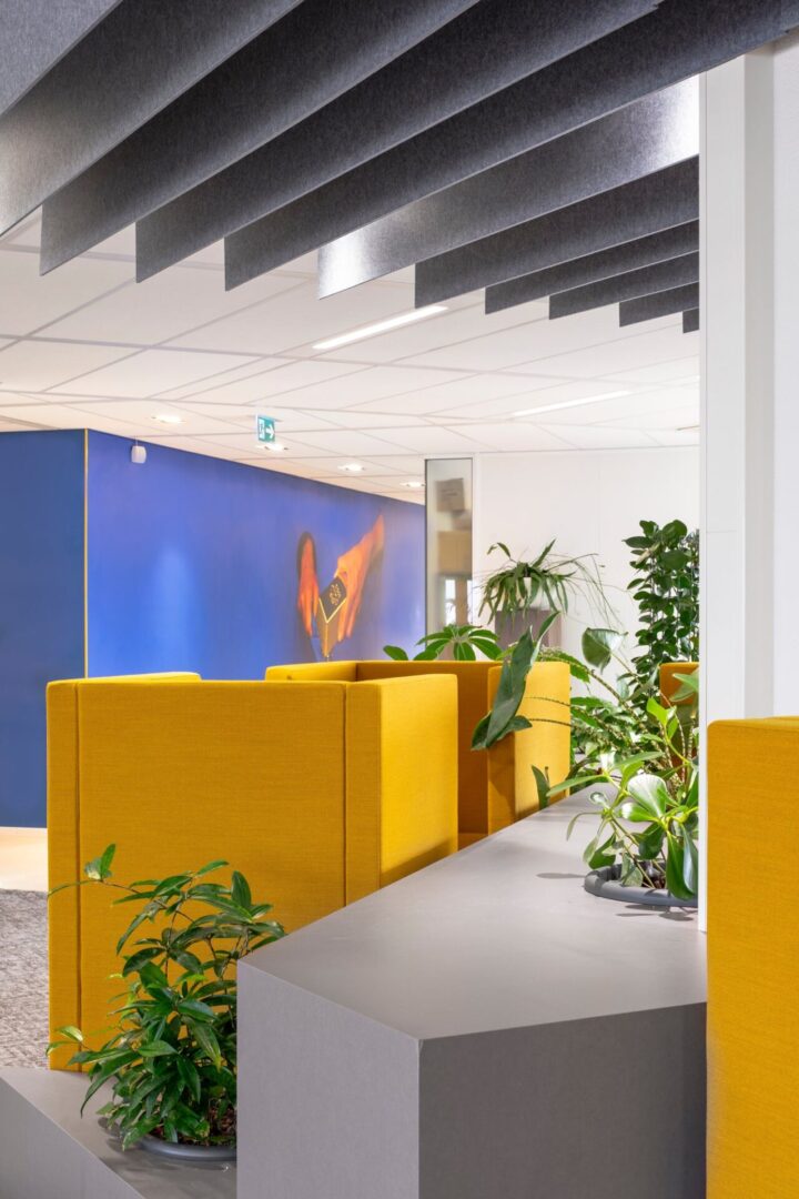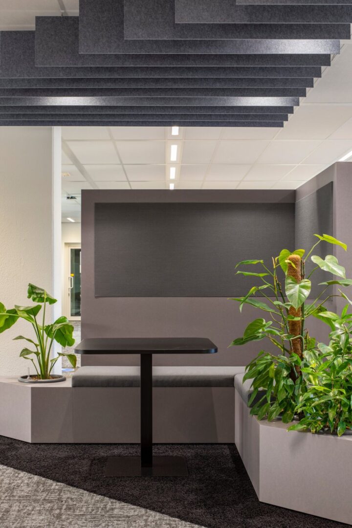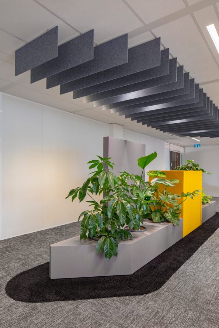 Naast vormgeving spelen ook functionele aspecten een belangrijke rol bij Burghards interieurconcept. “Een van de ambities van de opdrachtgever is het groeien in aantal klanten. Een werkomgeving waar medewerkers zich prettig voelen levert daar een grote bijdrage aan. In het interieur zijn daarom overlegeilanden gecreëerd met hoogpolig tapijt, veel beplanting, hoge stoelen en banken. Dit zorgde voor een huiselijke sfeer. De overlegeilanden doorbreken de zichtlijnen in het open kantoor, waardoor de ruimtes minder groot en huiselijker worden ervaren. Het hoogpolige tapijt geeft niet alleen een gemoedelijke sfeer, maar verbetert ook de ruimteakoestiek.”