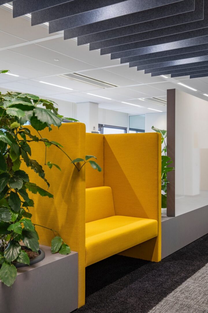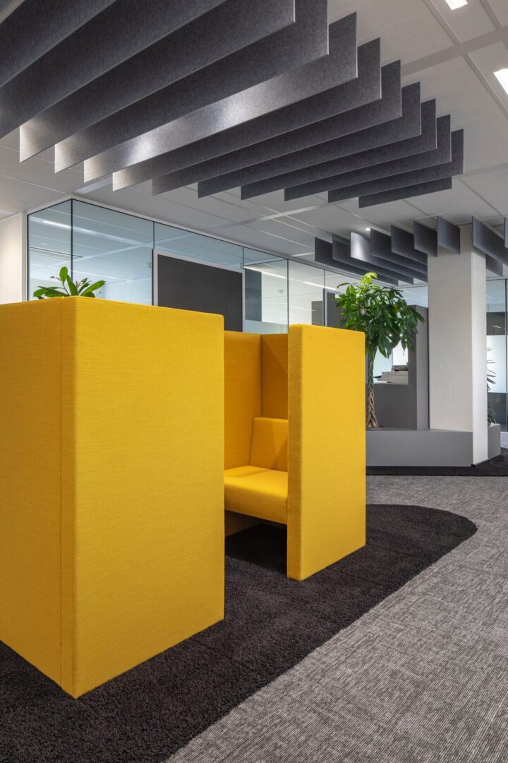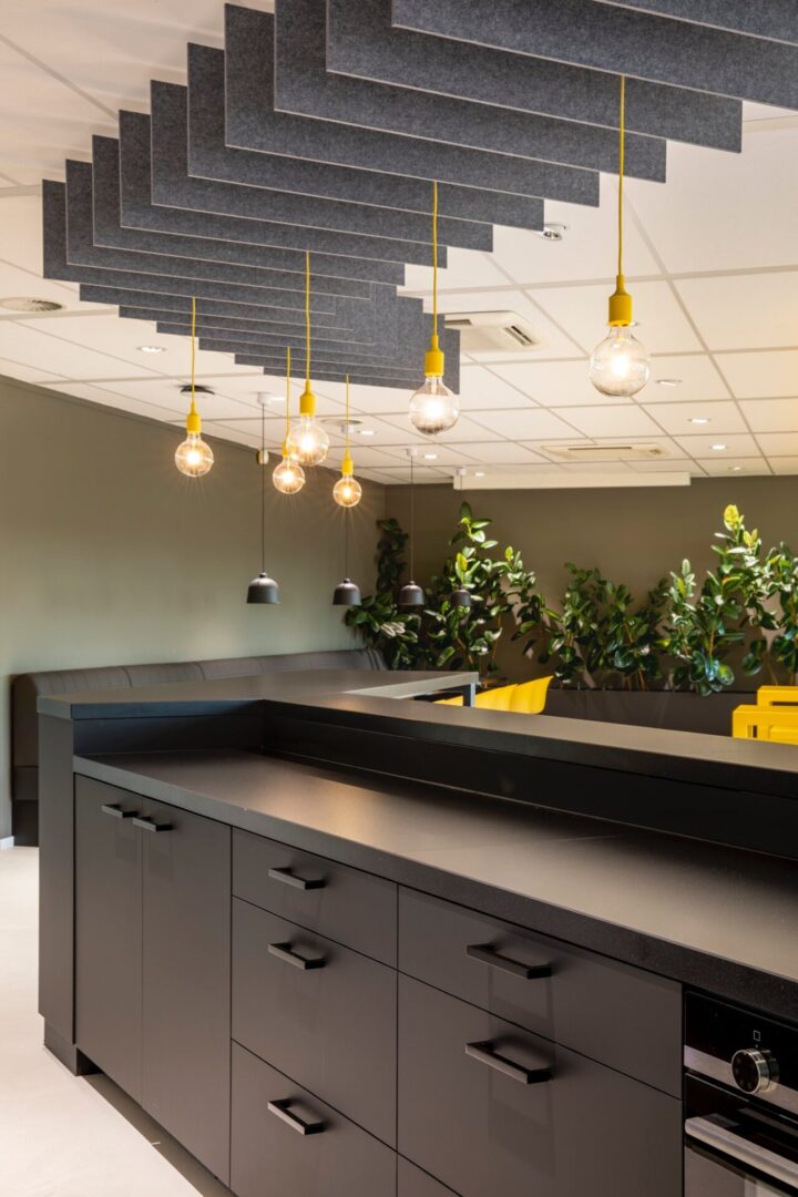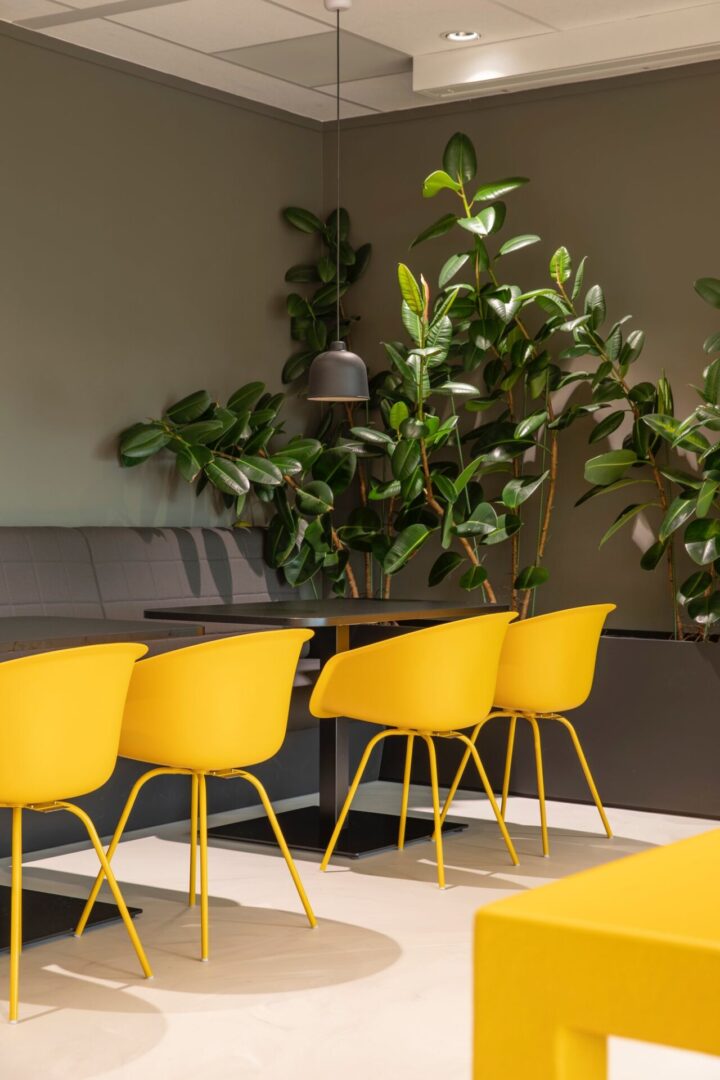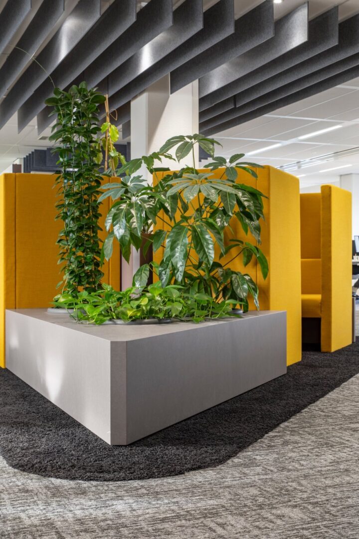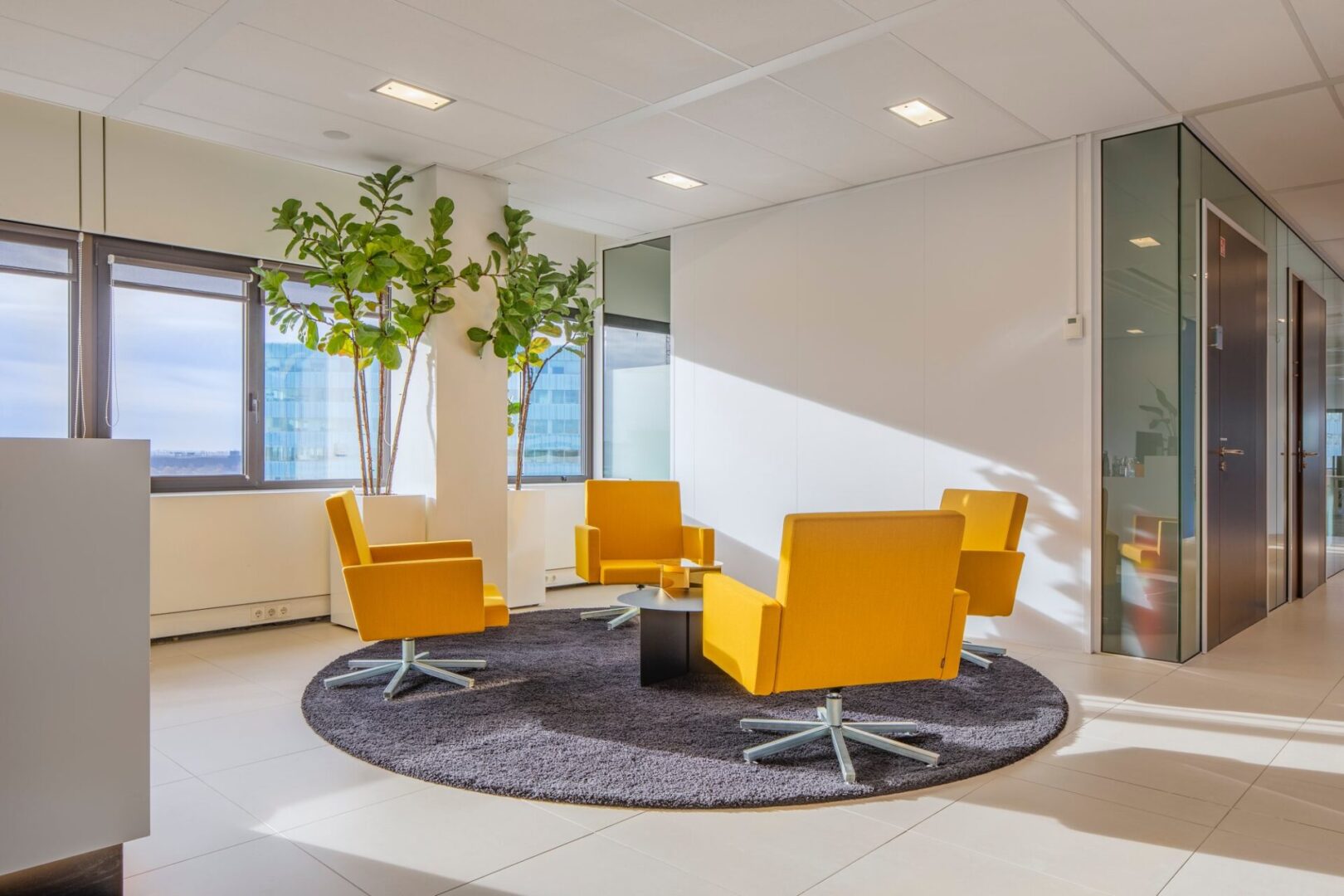 Naast vormgeving spelen ook functionele aspecten een belangrijke rol bij Burghards interieurconcept. “Een van de ambities van de opdrachtgever is het groeien in aantal klanten. Een werkomgeving waar medewerkers zich prettig voelen levert daar een grote bijdrage aan. In het interieur zijn daarom overlegeilanden gecreëerd met hoogpolig tapijt, veel beplanting, hoge stoelen en banken. Dit zorgde voor een huiselijke sfeer. De overlegeilanden doorbreken de zichtlijnen in het open kantoor, waardoor de ruimtes minder groot en huiselijker worden ervaren. Het hoogpolige tapijt geeft niet alleen een gemoedelijke sfeer, maar verbetert ook de ruimteakoestiek.”