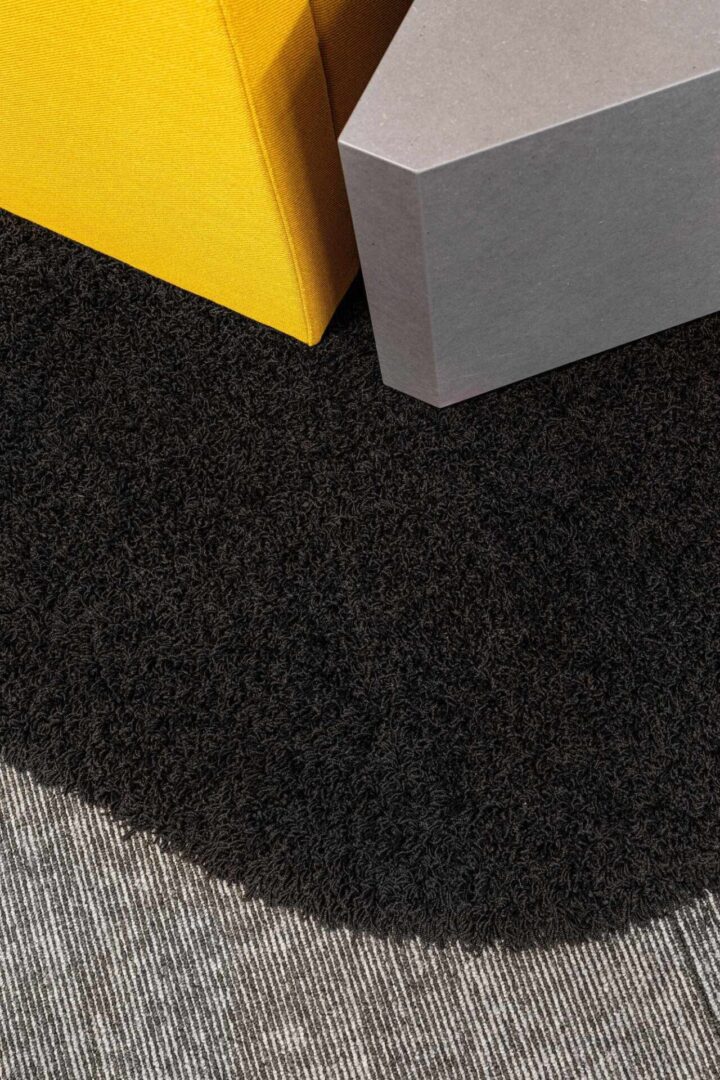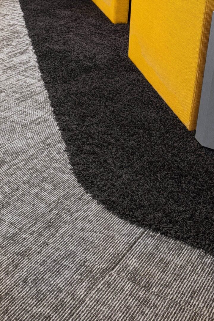 Het budget zorgde voor een duidelijke afkadering van de mogelijkheden. Burghard: “In mijn voorstellen maakte tapijt daarom standaard deel uit van het interieurconcept. Uiteindelijk is bij gekozen voor grijze bouclé tapijttegels (type ‘landschap’) met strakke lijnen, gecombineerd met grote afgeronde vlakken van zwart hoogpolig tapijt. TREU interior specials kon projectkwaliteit tapijt met een rijke uitstraling realiseren zonder de hoge prijzen die veel andere aanbieders van exclusieve interieurspecials vragen.”