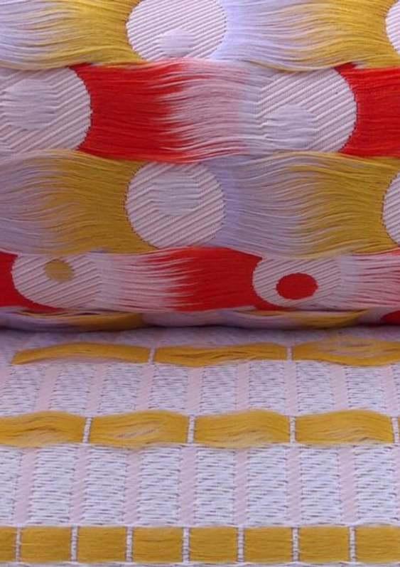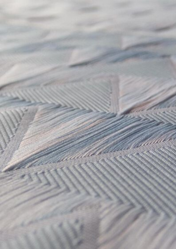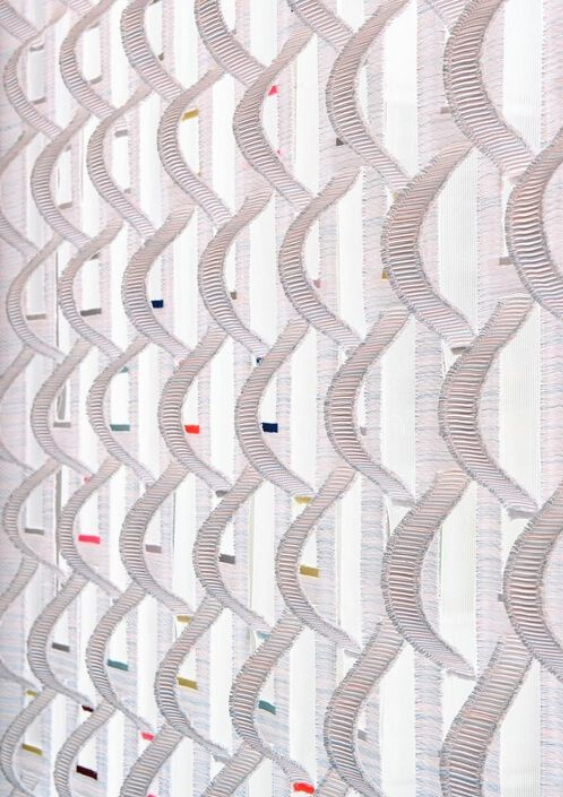 We zien veel complexe weefsels, veelal met losse franjes. Ook 3D weefsels zijn in trek, neem bijvoorbeeld het ‘Fringes & Floats’ project van ontwerpbureau Alissa+Nienke. Het project is een samenwerking met EE Exclusives, een bedrijf gespecialiseerd in jaquard weven. Onderzoek naar de technische mogelijkheden van jaquard machines resulteerde in collectie geweven stoffen die bijvoorbeeld als wandbekleding toegepast kunnen worden.