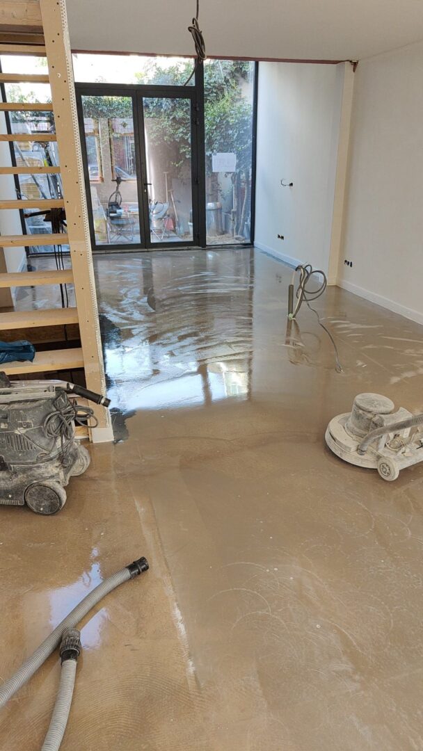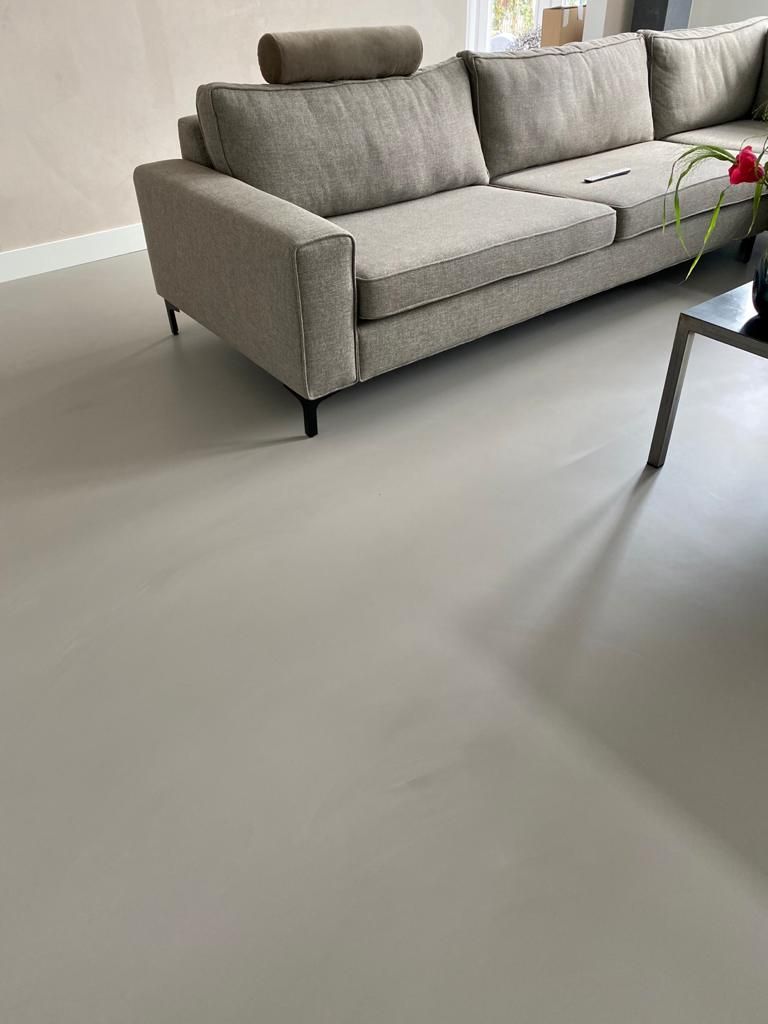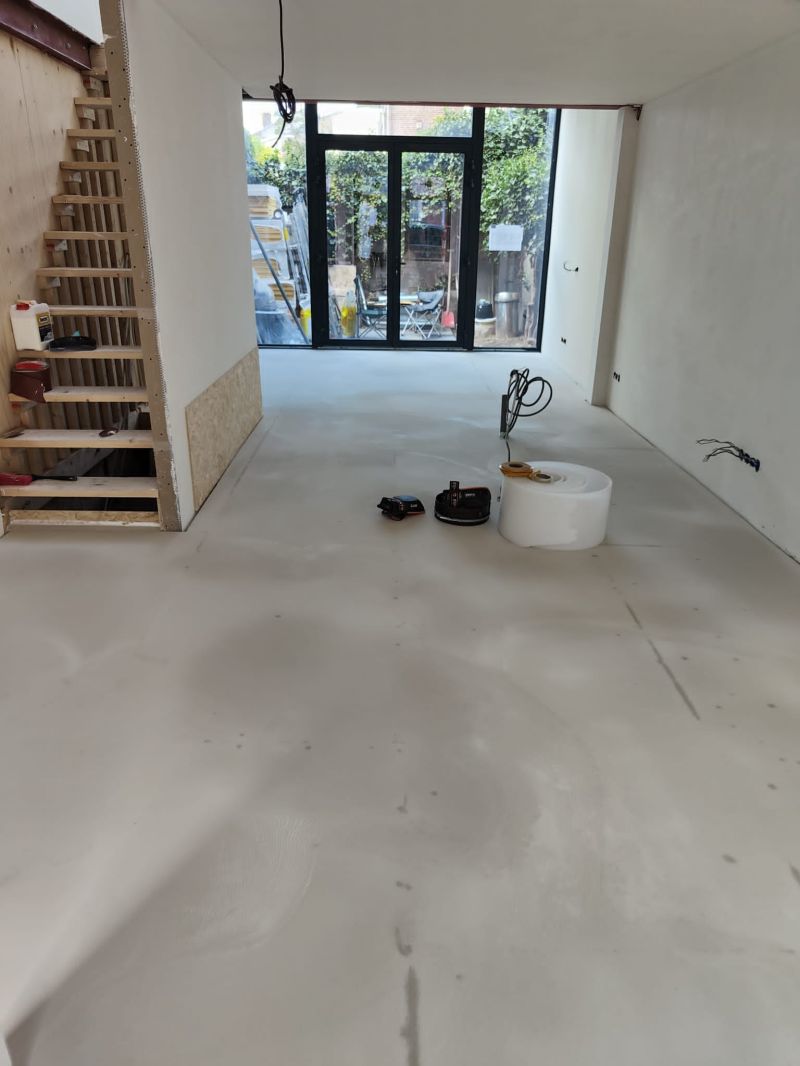 De gietvloer is aangebracht op een anhydriet ondervloer, dat grondig werd geschuurd voor optimale hechting. Met het aanbrengen van een primerlaag is de zuigende werking van de ondergrond opgeheven.
