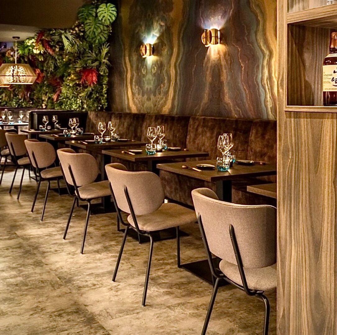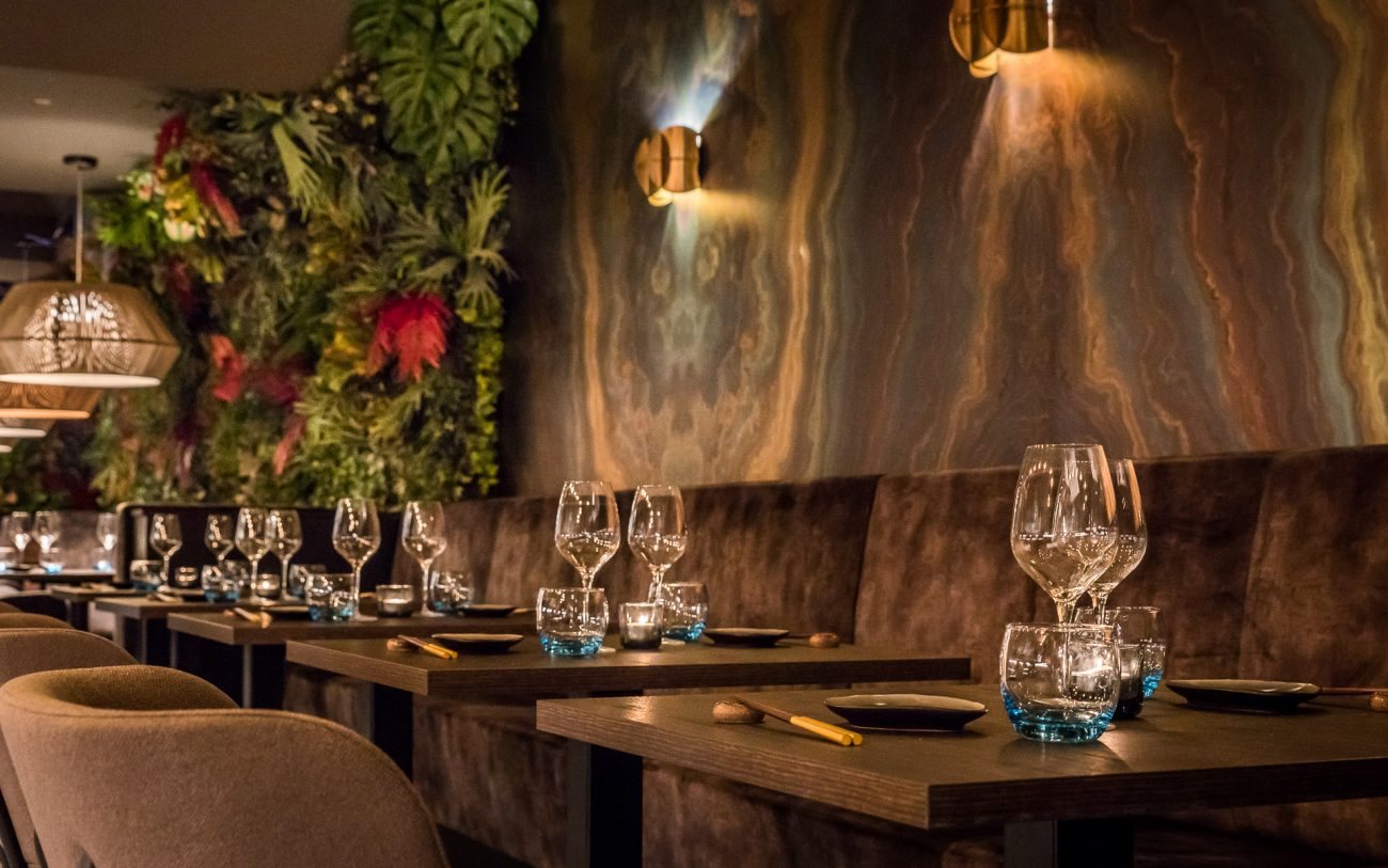 Goudtinten zijn tegenwoordig overal te vinden: op wanden, in lampen, en zelfs op plafonds! Zo heeft TREU een opvallende eyecatcher ontworpen voor het plafond en de wanden van het restaurant Kyatcha in Den Haag. Dit was onderdeel van een project van Art2Go Interieurprojecten.