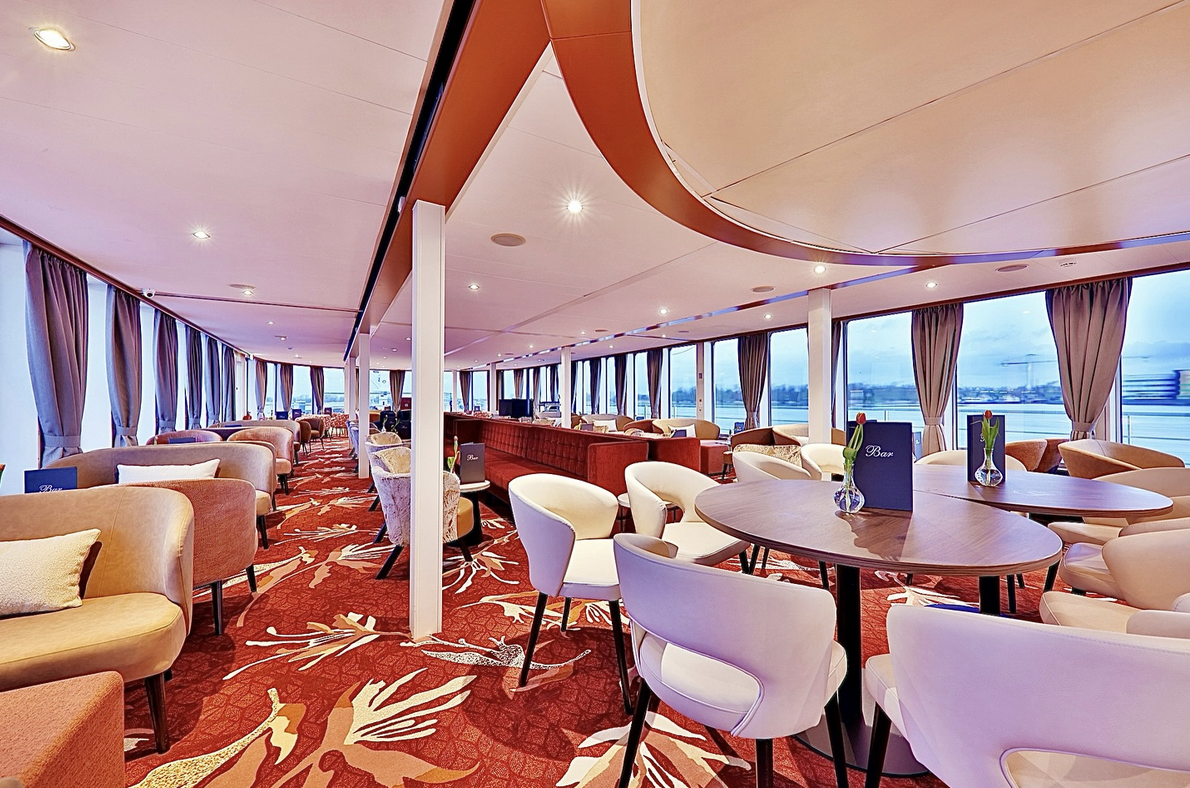 Aan boord van het luxe cruiseschip MS VistaBelle is het restaurant een waar stijlstatement. Het restaurant van MS VistaBelle ademt een warme, uitnodigende sfeer dankzij het samenspel van aardetinten zoals terracotta, cognac en beige. Het gekozen grote dessin in het tapijt benadrukt deze warmte en voegt een vleugje luxe toe. De ruimte nodigt uit om even stil te staan en te genieten van het moment.