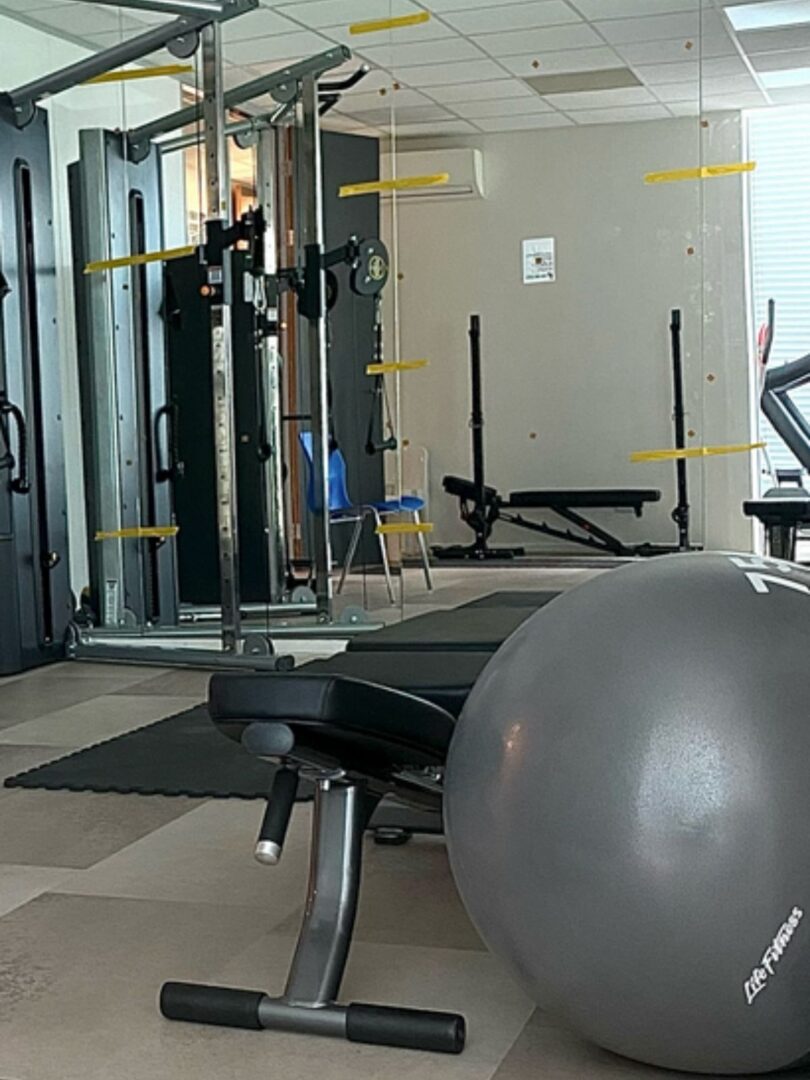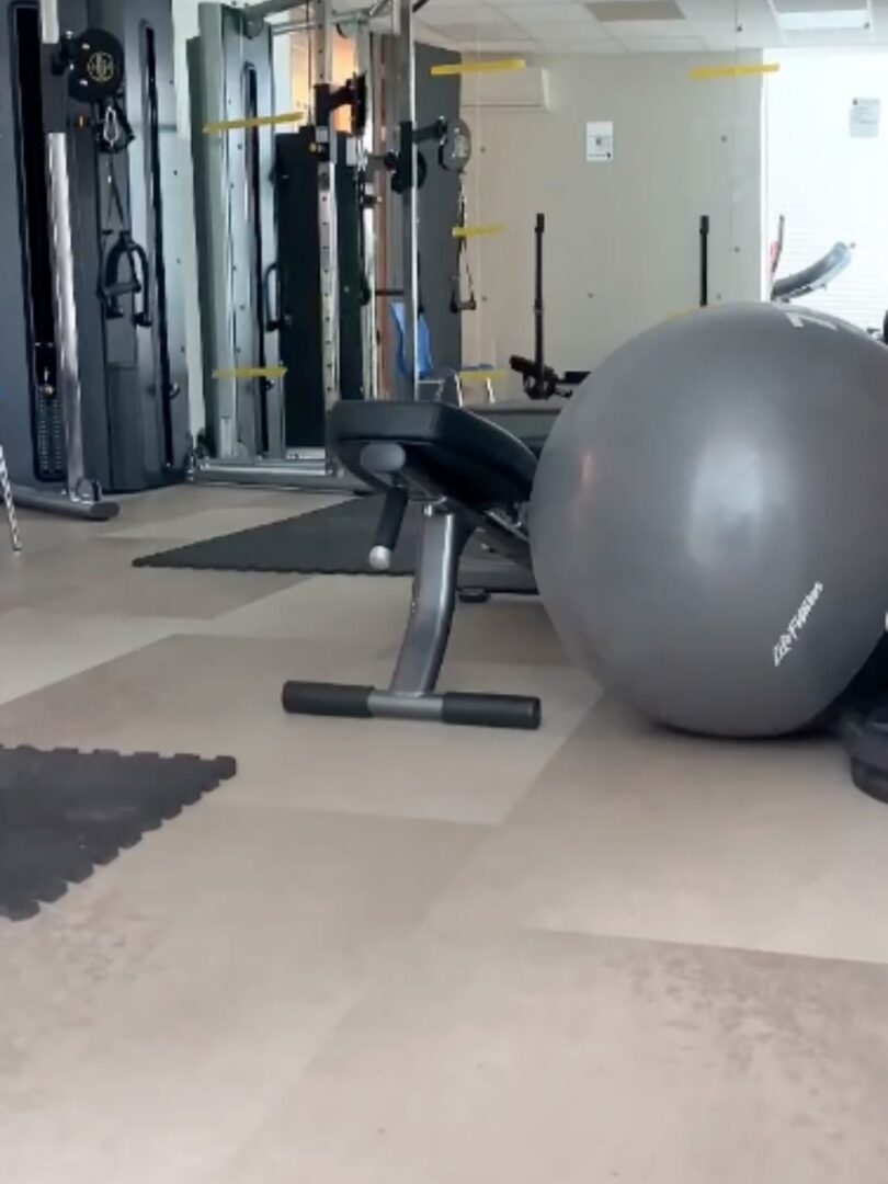 De gekozen PVC-vloer combineert een strakke, moderne betonlook met de functionele eigenschappen die een fitnessruimte vraagt. De tegels zijn veerkrachtig, wat zorgt voor extra comfort tijdens het sporten en de belasting op gewrichten vermindert. Tegelijkertijd is het materiaal slijtvast en onderhoudsvriendelijk, ideaal voor een ruimte die dagelijks intensief gebruikt wordt.
