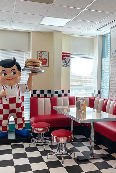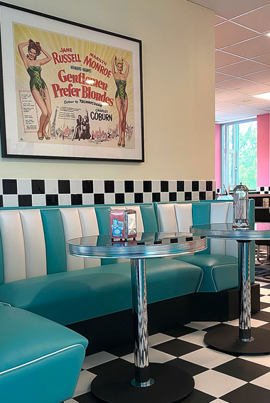 De PVC-vloer vormt de perfecte basis voor het totaalconcept dat BNLA Architecten heeft ontworpen. De kleurrijke zitjes in rood, turquoise en geel knallen tegen de zwart-witte ondergrond, terwijl chroomaccenten de glamour van de jaren ’50 benadrukken. Het is een setting die doet denken aan klassieke diners, jukeboxen, milkshakes en rock-‘n-roll. Een kleine ontsnapping naar een andere tijd, midden in het moderne Amsterdam.