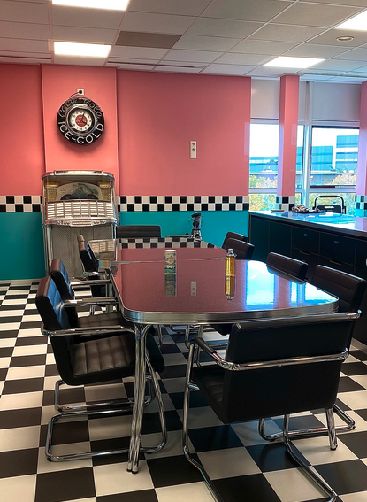 De jaren ’50-sfeer nodigt uit tot ontspanning en informele ontmoetingen. Collega’s komen hier samen, niet alleen om te lunchen, maar ook voor een koffiemoment, een informeel overleg of gewoon een praatje. De speelse, toegankelijke uitstraling van de ruimte verlaagt drempels en stimuleert sociale interactie; onmisbaar voor een goede werksfeer en teambuilding.