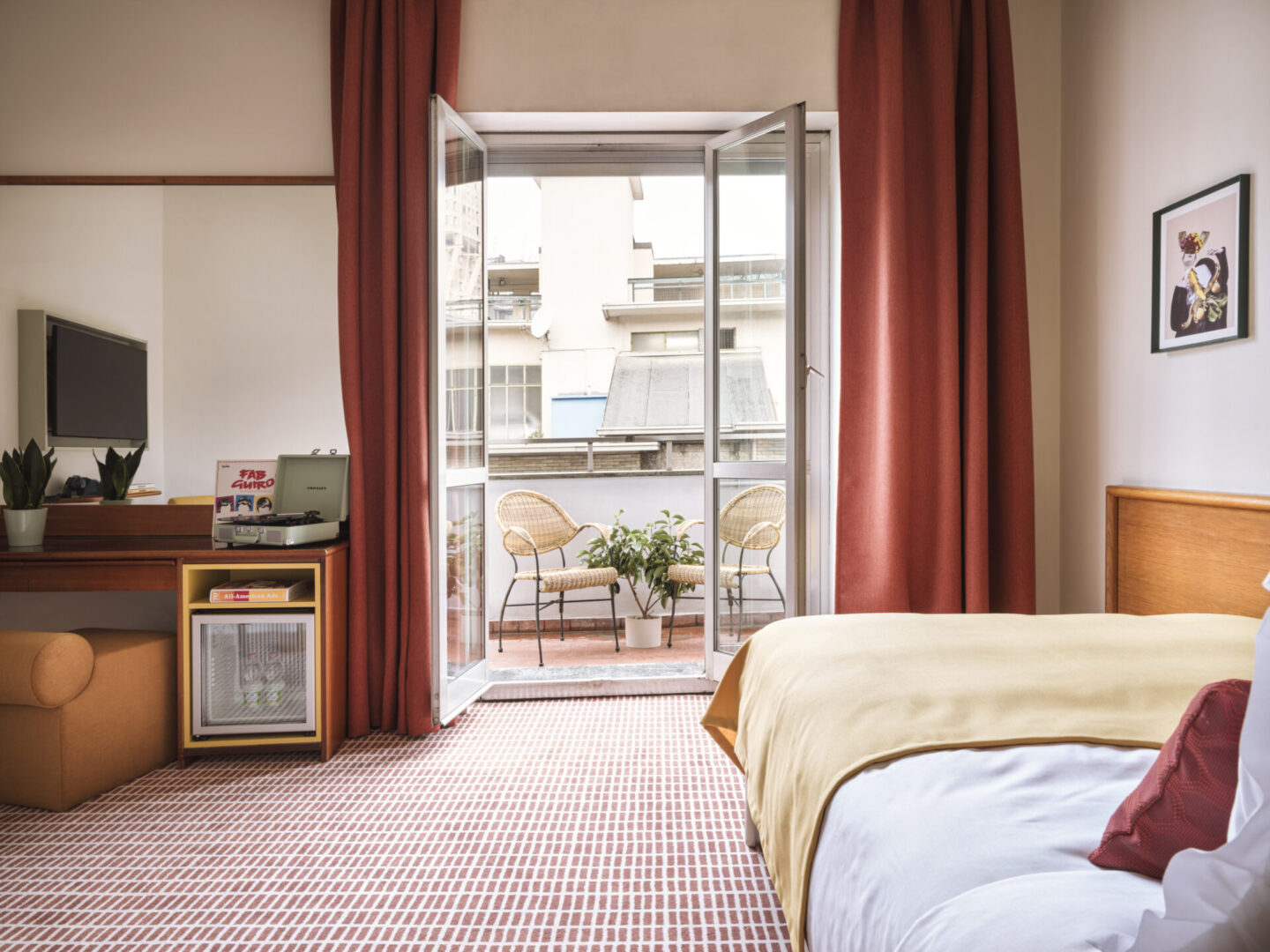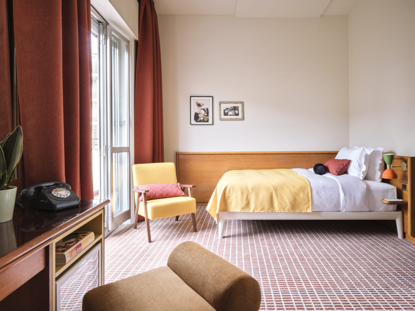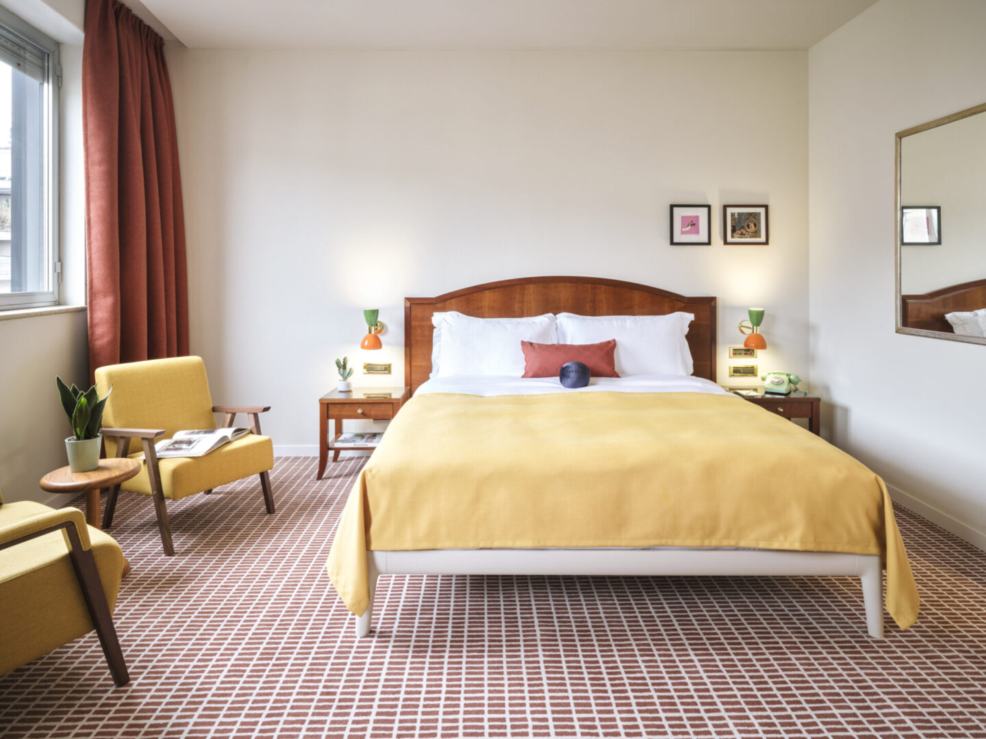 Het rood geblokte printtapijt, afgestemd op de kleuren van de gordijnen en kussens, vormt een harmonieus geheel met het beddengoed. De levendige print op de vloer biedt een opvallend contrast met het verder minimalistische interieur van de kamers. Dit zorgt voor een elegante balans tussen drukke patronen en rustige, gestroomlijnde elementen.