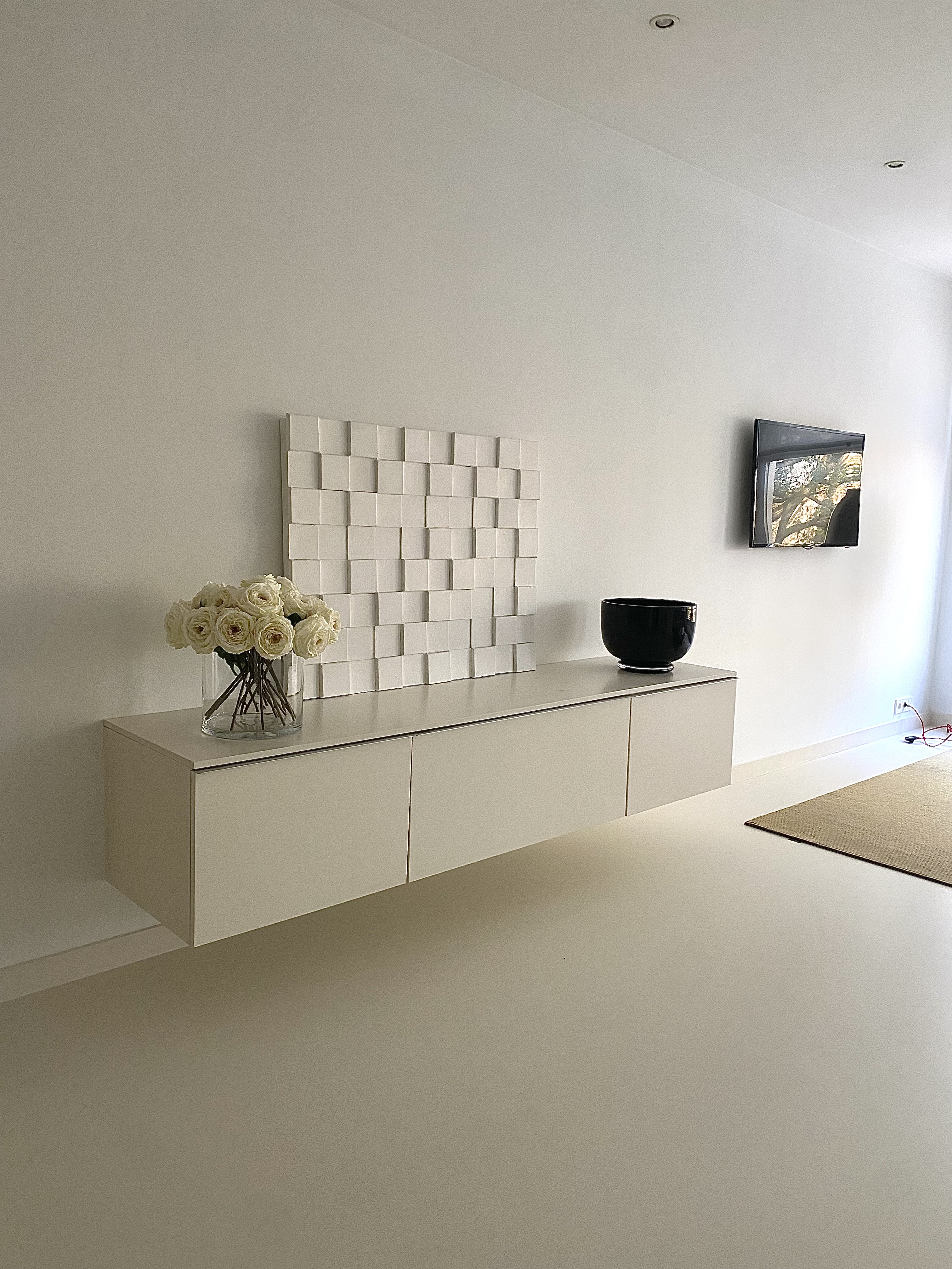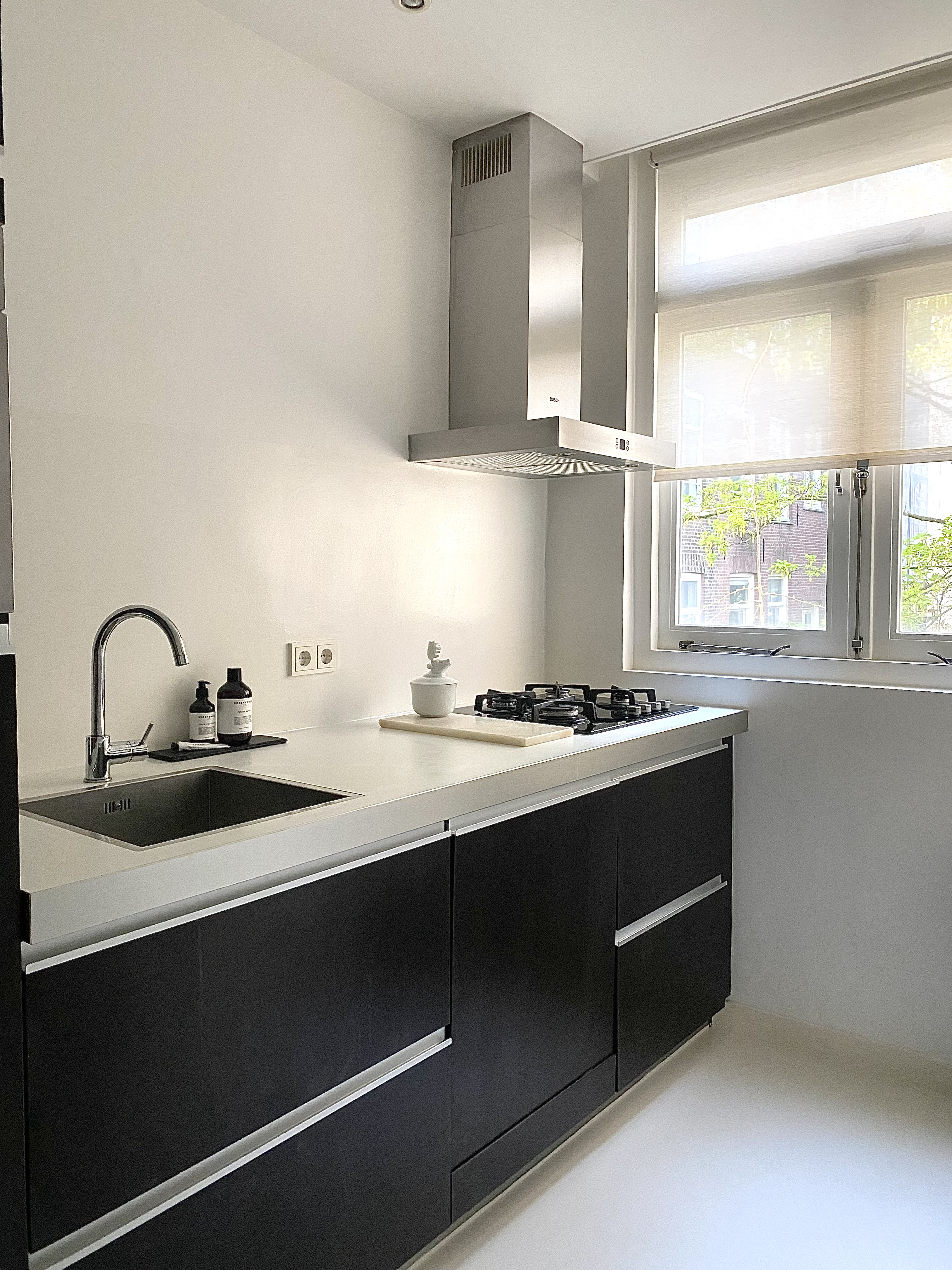 Het gehele appartement is voorzien van een naadloze Artificial gietvloer. Alle ruimtes – woonkamer, keuken en slaapkamer – zijn voorzijn van dezelfde parelwitte afwerking, wat zorgt voor een perfect naadloos geheel door de hele woning. Deze klassieke en populaire kleur zorgt voor een tijdloze, verfijnde look die elke ruimte transformeert. De parelwitte tint vertelt een verhaal van eigentijdse elegantie. De subtiele glans in combinatie met de naadloze overgang naar andere ruimtes zorgt voor een rustige, moderne uitstraling die past bij de beoogde ambiance.